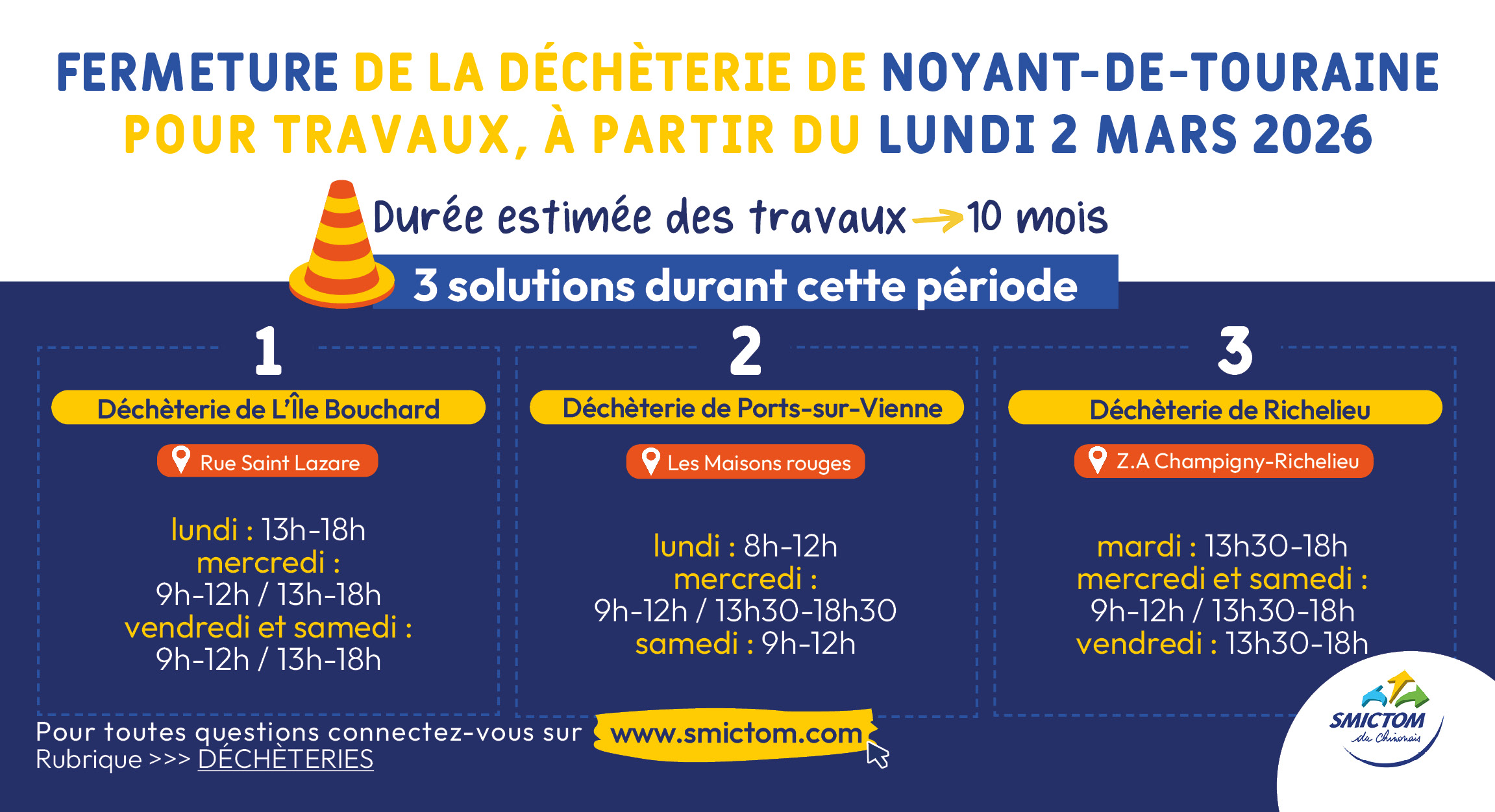 La déchèterie de Noyant-de-Touraine ferme ses portes, pour travaux, le lundi 2 mars 2026 au matin, pour une durée estimée à 10 mois.