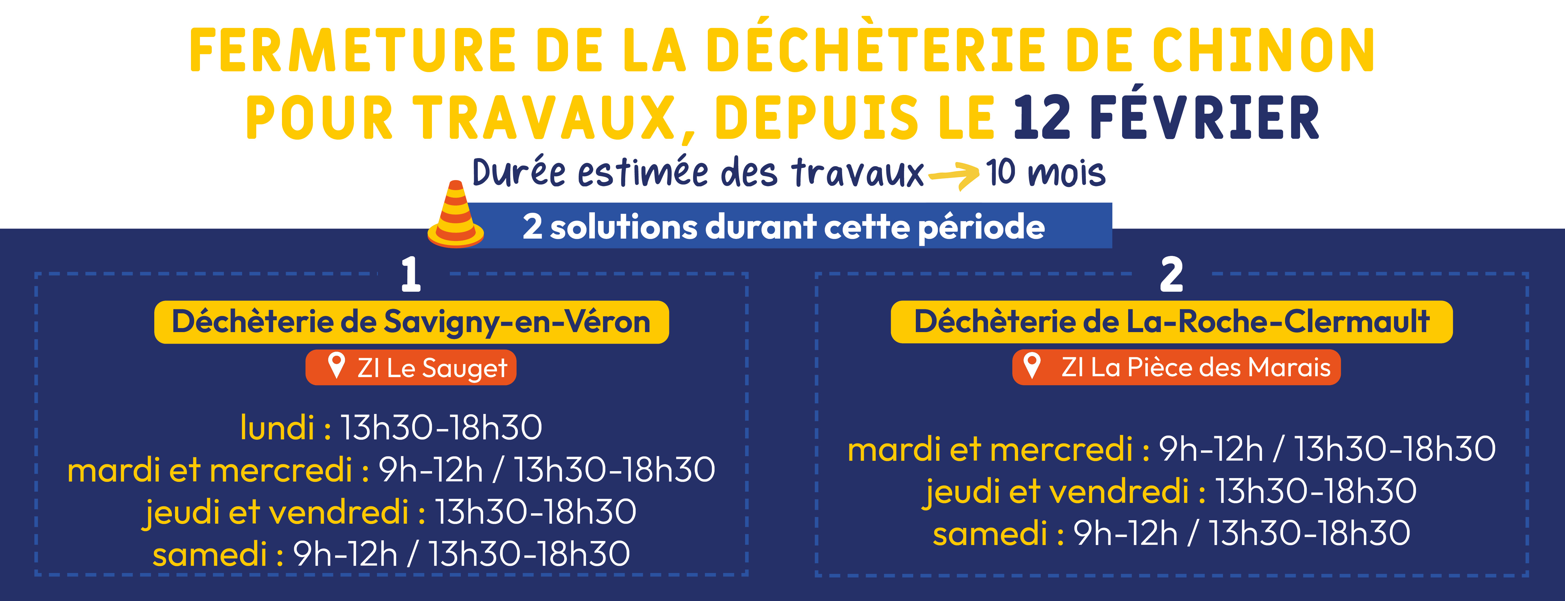 Pendant toute la durée des travaux, les horaires des déchèteries de Savigny-en-Véron et de La-Roche-Clermault selon les horaires ci-dessus.
